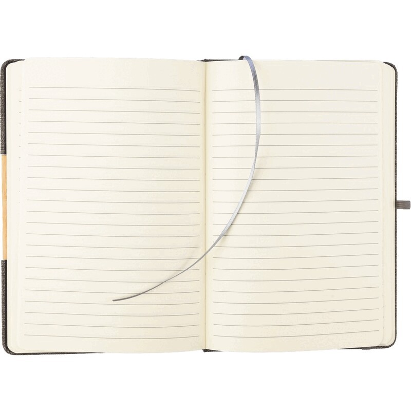 Notebook approx. size A5 with 80 lined pages, bookmark ribbon for easy marking of the last page or important notes, an extra elastic band closure in matching colour, foldable cover with a bamboo detail turns into a phone holder, fit inside of a school backpack, product made from RPET