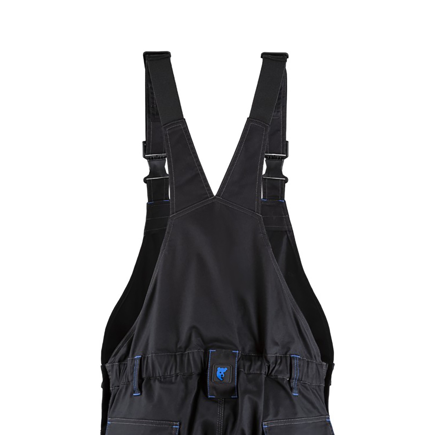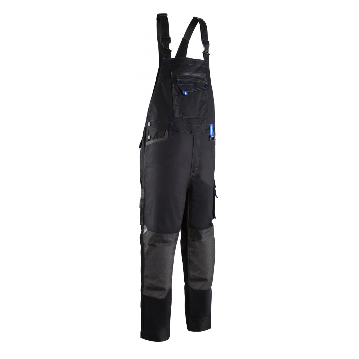 სამუშაო კომბინიზონი რეგულირებადი ბრეტელებით, 9 ჯიბით, ელასტიკური მანჟეტით წელის არეში, სამუხლე ჯიბეებით.