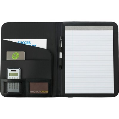 პროფესიონალური A4 ზომის საკონფერენციო საქაღალდე დამზადებულია PU, PVC და გამძლე პოლიესტერისგან (210D). მოყვება 25 ფურცლიანი ზოლიანი რვეული, შიდა ჯიბეები დოკუმენტების დასალაგებლად და კალმის სამაგრი (კალამი არ მოყვება). იდეალურია შეხვედრებისთვის, პრეზენტაციებისთვის ან ყოველდღიური საოფისე გამოყენებისთვის. ელეგანტური შავი დიზაინი.