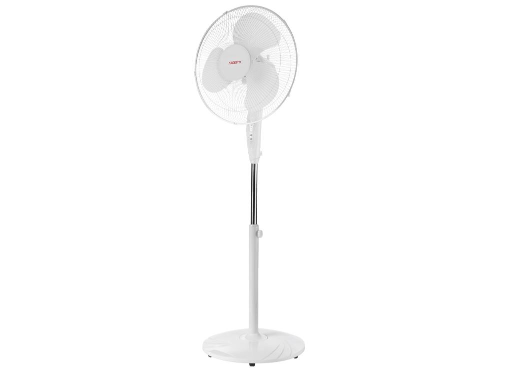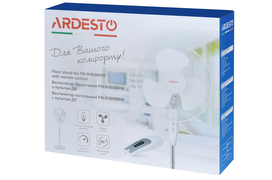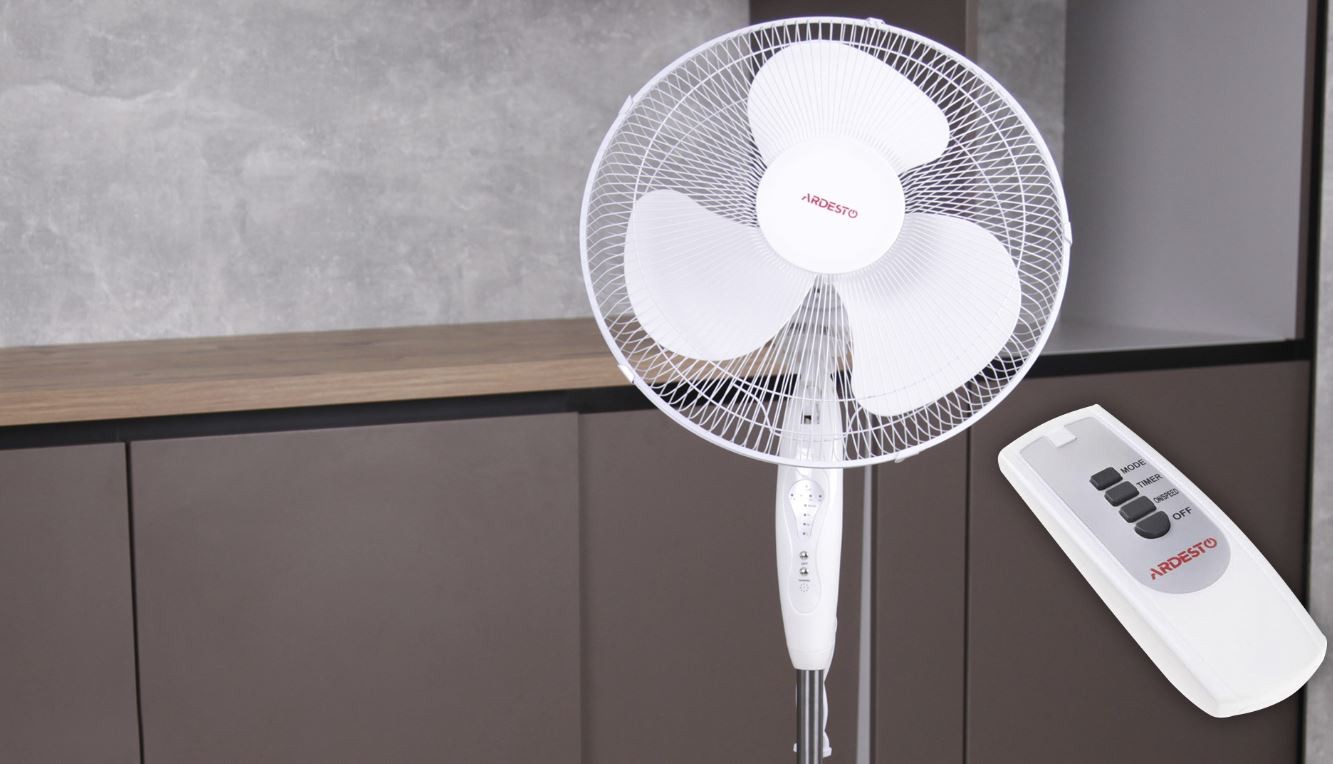 თეთრი ფერის დასადგამი ვენტილატორი დისტანციური მართვის პულტით და მრგვალი საყრდენით. მოდელი დამზადებულია საიმედო, პრაქტიკული და გამძლე მასალისგან.